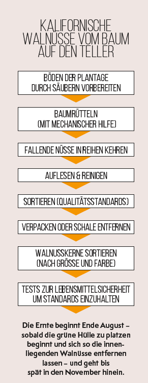 Die Erntesaison dauert je nach Sorte von Ende August bis spät in den November hinein. Die Walnüsse sind während der Reifezeit durch ihre äußere, weichere Hülle und die Schale, die den inneren Kern umgibt, doppelt geschützt. Sobald die äußere grüne Hülle der Baumfrüchte zu platzen beginnt, lassen sich die innen liegenden Nüsse entfernen und sind reif für die Ernte. Zuerst wird der Boden der Plantage komplett gesäubert. Dann schütteln spezielle Rüttelmaschinen jeden Baum so kräftig, dass Tausende Nüsse auf den Boden fallen. Anschließend lesen mechanische Erntemaschinen sie für die spätere Reinigung auf.