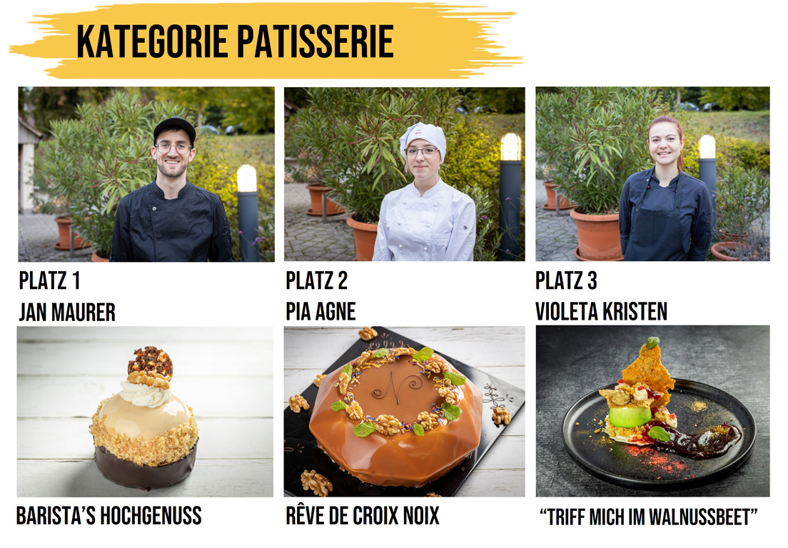 Der Konditormeister Jan Maurer aus dem Schwarzwälder Meißenheim belegte mit „Barista’s HochgeNUSS“ den ersten Platz in der Kategorie Patisserie. Das formvollendete Törtchen mit flüssigem Walnusskern, luftig-leichter Mousse und schokoladigem Crunch vereint die Aromen aus Kaffee und Walnüssen harmonisch miteinander. Das ausgewogene Spiel vielfältiger Aromen und Texturen mit besonders cremiger und knuspriger Note sorgten für Begeisterung bei der Jury.