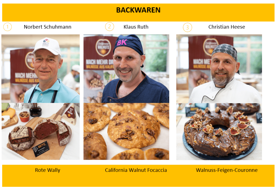Den 1. Platz in der Kategorie Backwaren belegte Norbert Schuhmann aus Erlangen (Bayern) mit seiner Kreation „Rote Wally“. Das rustikale rote Landbrot mit gerösteten kalifornischen Walnüssen, fruchtiger Rote Beete und Vollkornsauerteig überzeugte die Jury durch die beeindruckende Optik und Geschmack sowie den Fokus auf den gesundheitlichen Mehrwert der kalifornischen Walnuss.