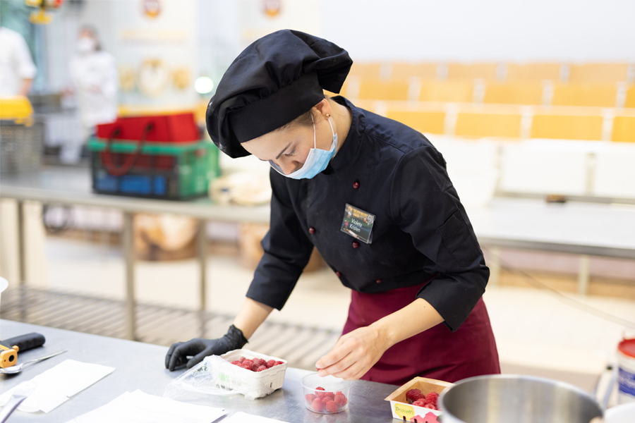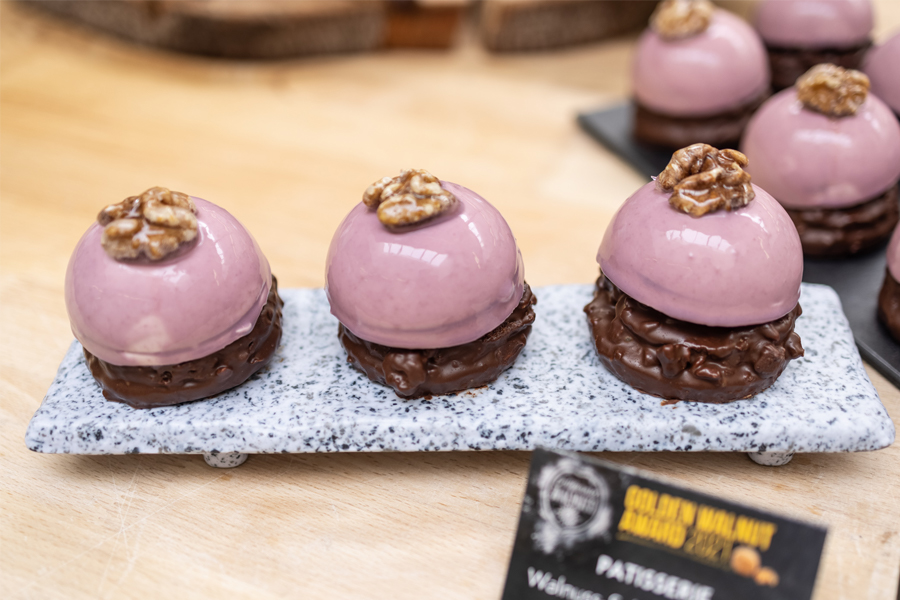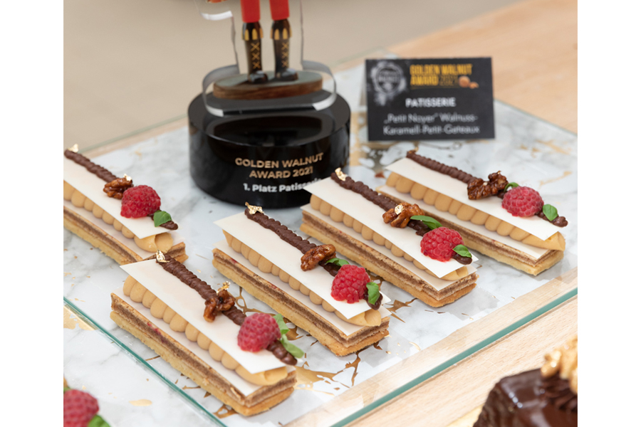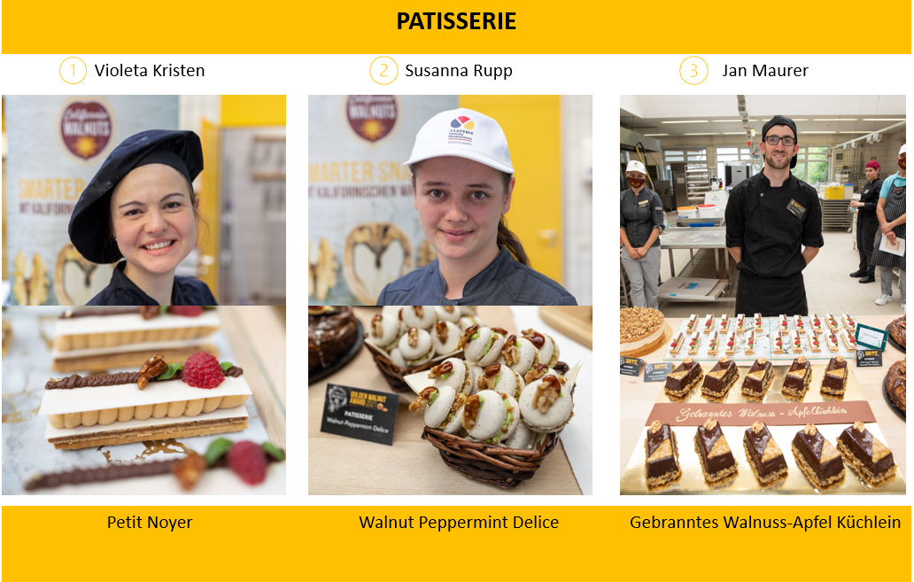 Die Konditormeisterin Violeta Kristen aus dem schwäbischen Markt Rettenbach sicherte sich den 1. Platz in der Kategorie Patisserie. Ihre „Petit Noyer“ ist ein filigranes Schokoladenplättchen-Dessert. Es eignet sich ideal für gehoben Anlässe und enthält die kalifornische Walnuss sowohl im Teig, im Jaconde und im „Gianduja" und kombiniert diese harmonisch mit Karamellmousse und Himbeergelee.
